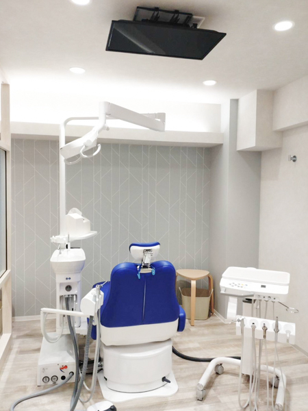 天井にはチェアーを倒したときに見られるモニターが付いており、治療やメンテナンス中に楽しんでもらえるようにしています。