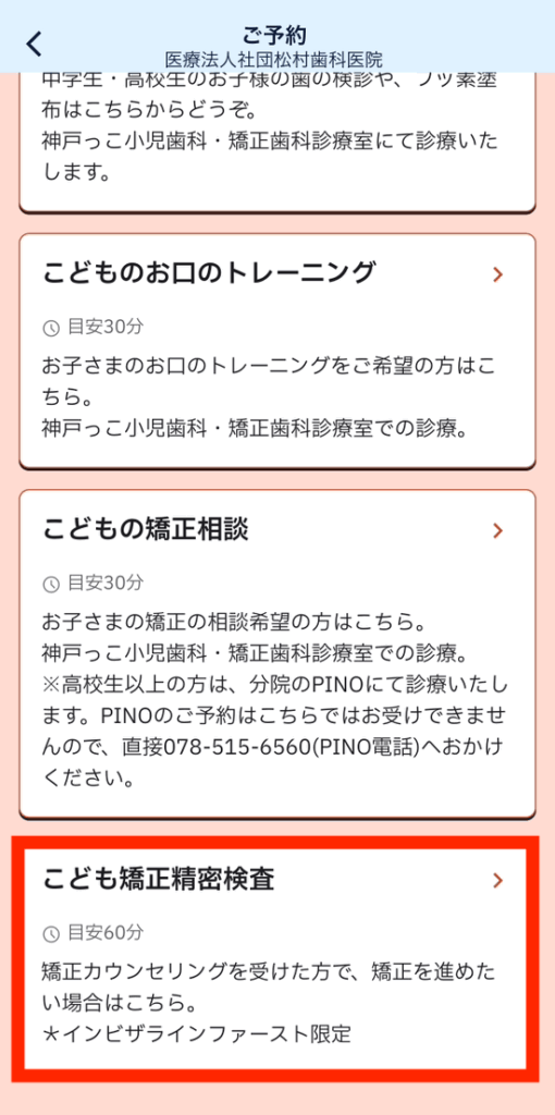 アプリを開き →「新たな予約をとる」→「こども矯正精密検査」を選択